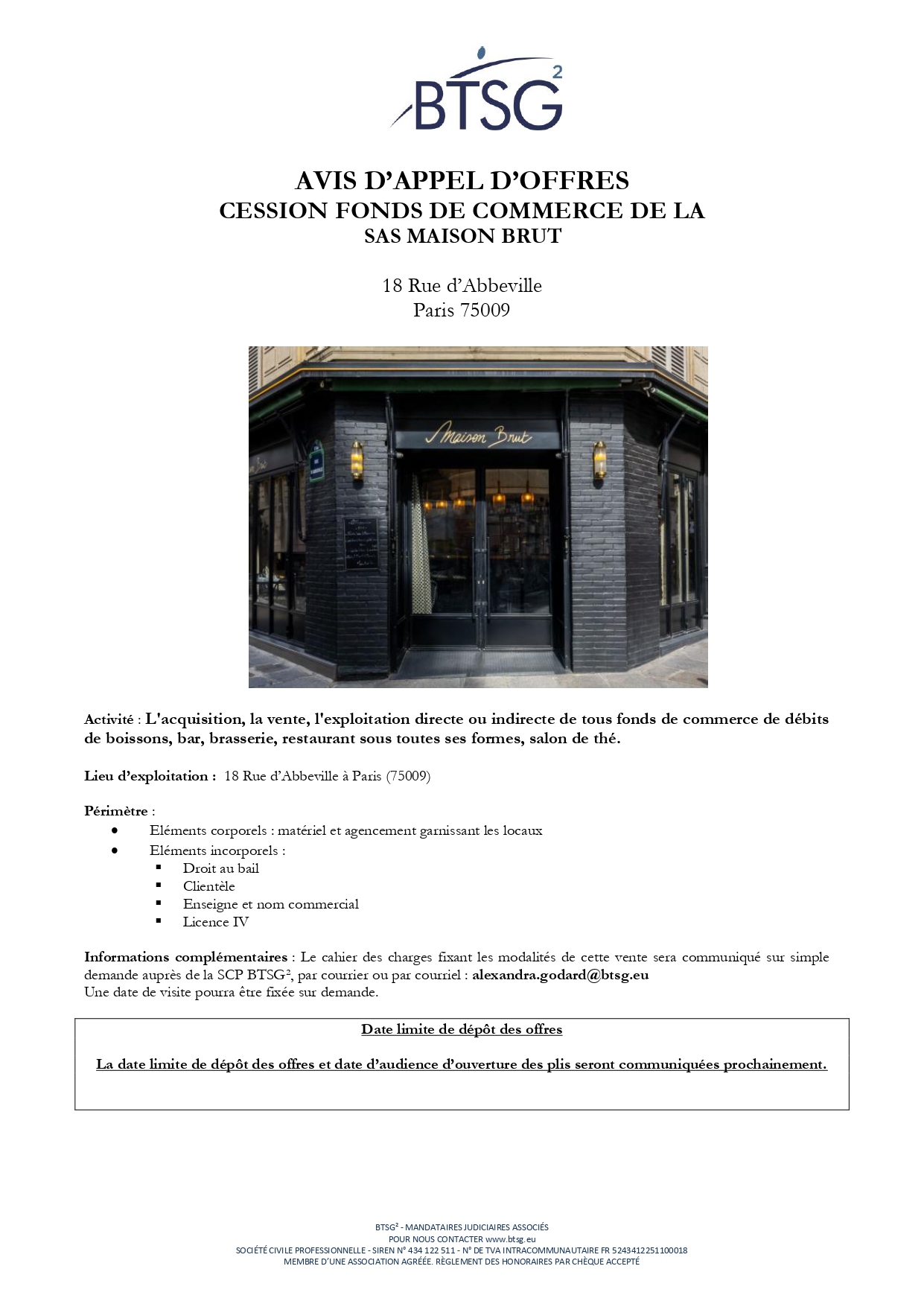 A vendre : RESTAURANT MAISON BRUT 75009 PARIS